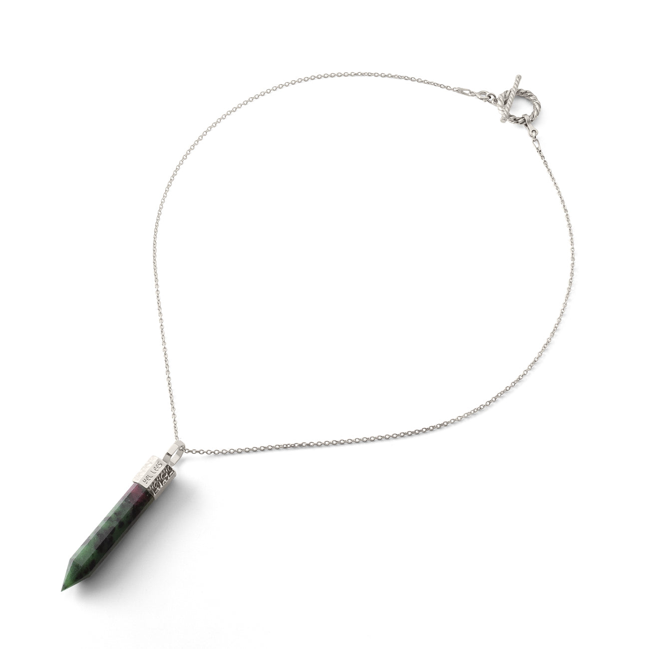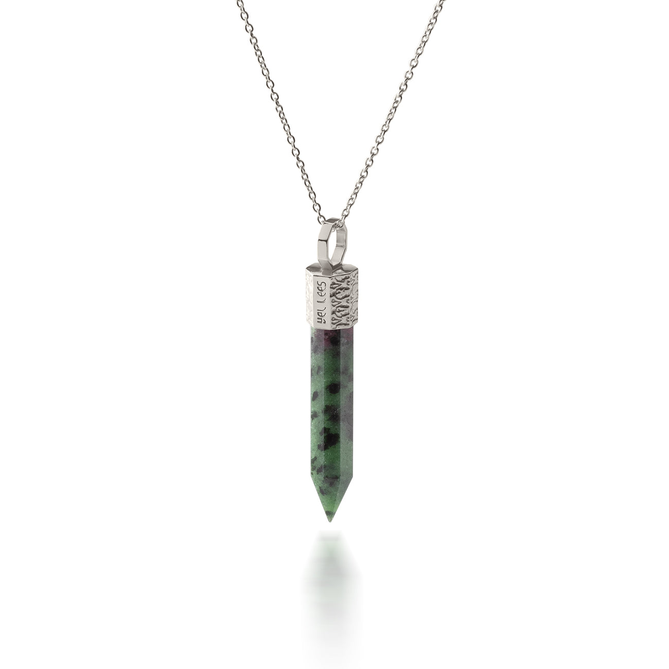 Naszyjnik z zoizytu z rubinem 44 mm ze srebra 925 pokrytego platyną z kolekcji TERRA 44 to kamień przemiany, pasji i odwagi. Łączy energię rubinu i zoizytu, tworząc harmonijny balans między spokojem a siłą działania. Idealny dla tych, którzy są w procesie wewnętrznego wzrostu i chcą żyć z sercem pełnym odwagi, miłości i świadomości.